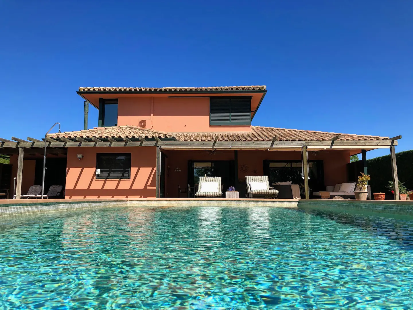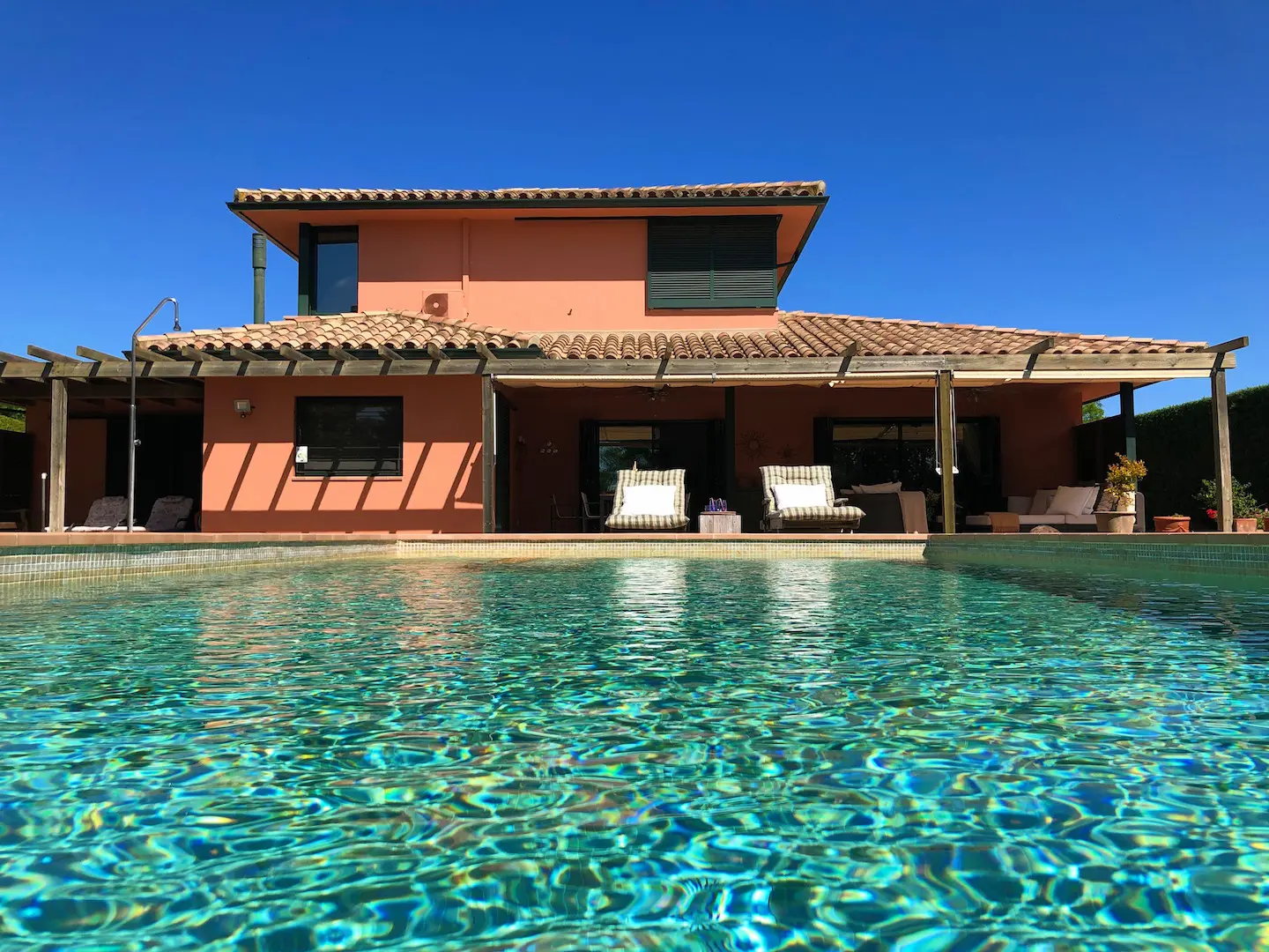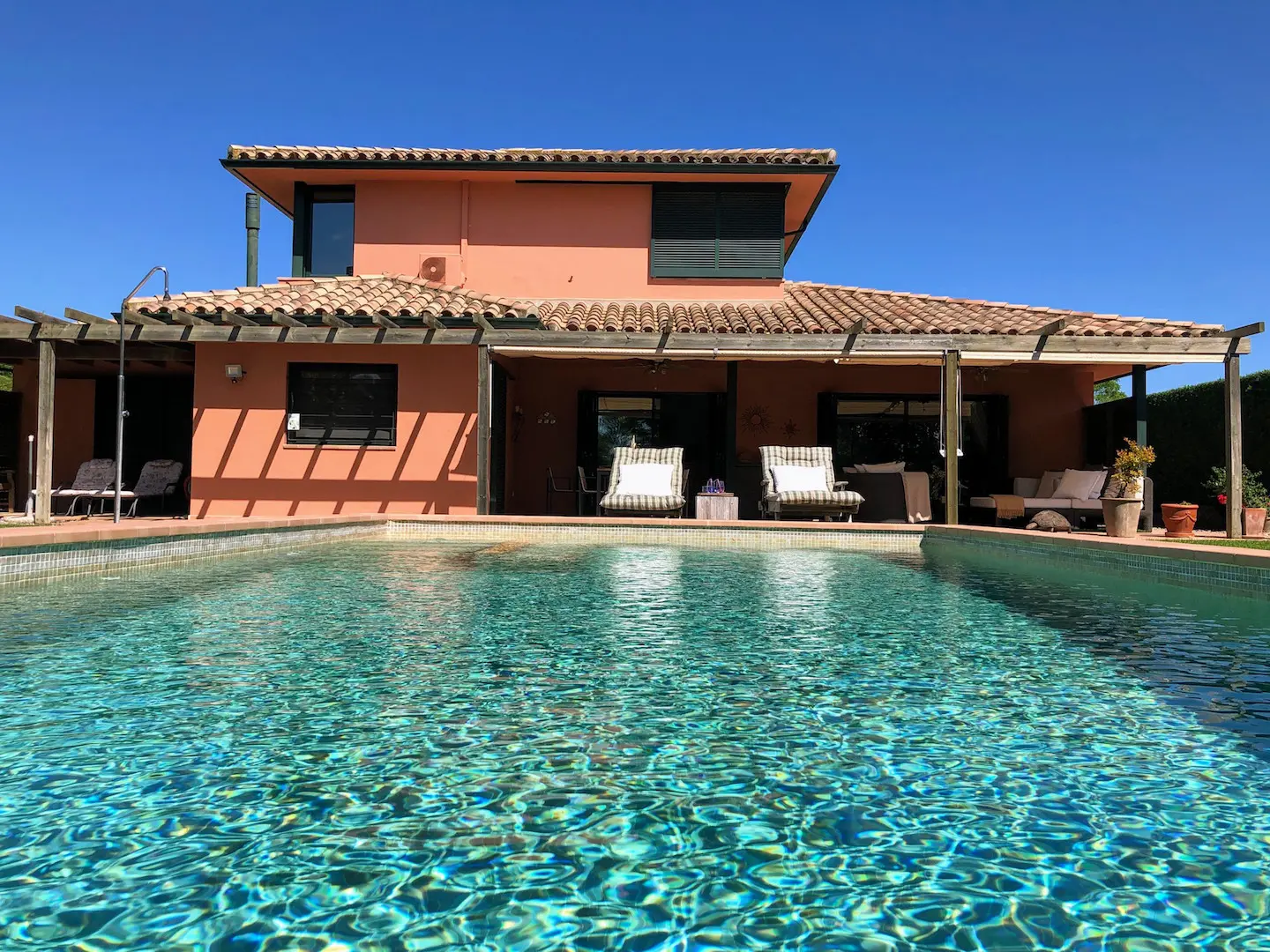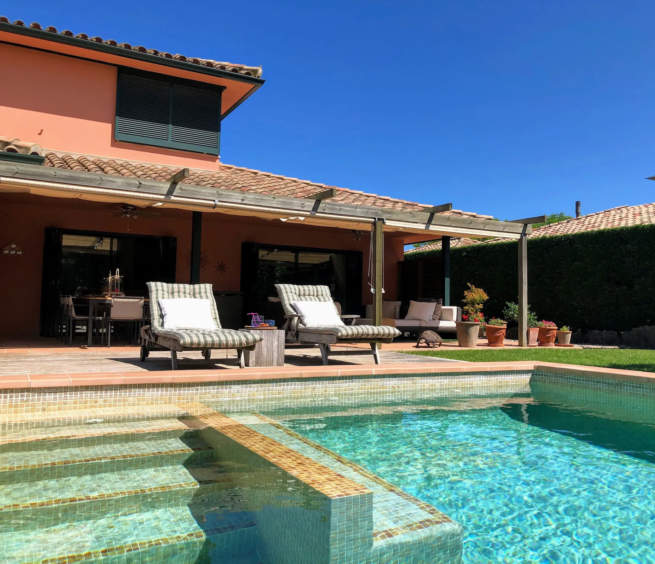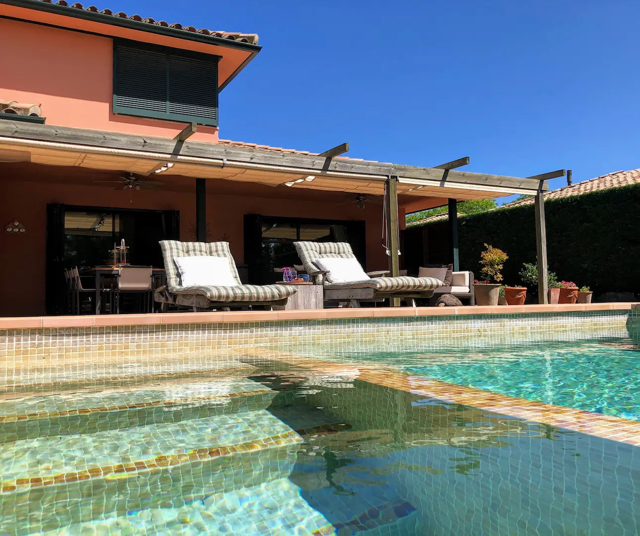 Het zwembad is luxe afgewerkt met ingebouwde trap, zitbank en zwembadverlichting. Eromheen liggen verschillende zonneterrassen en er is een buitendouche. Het overdekte terras kan verlengd worden met zonneschermen.