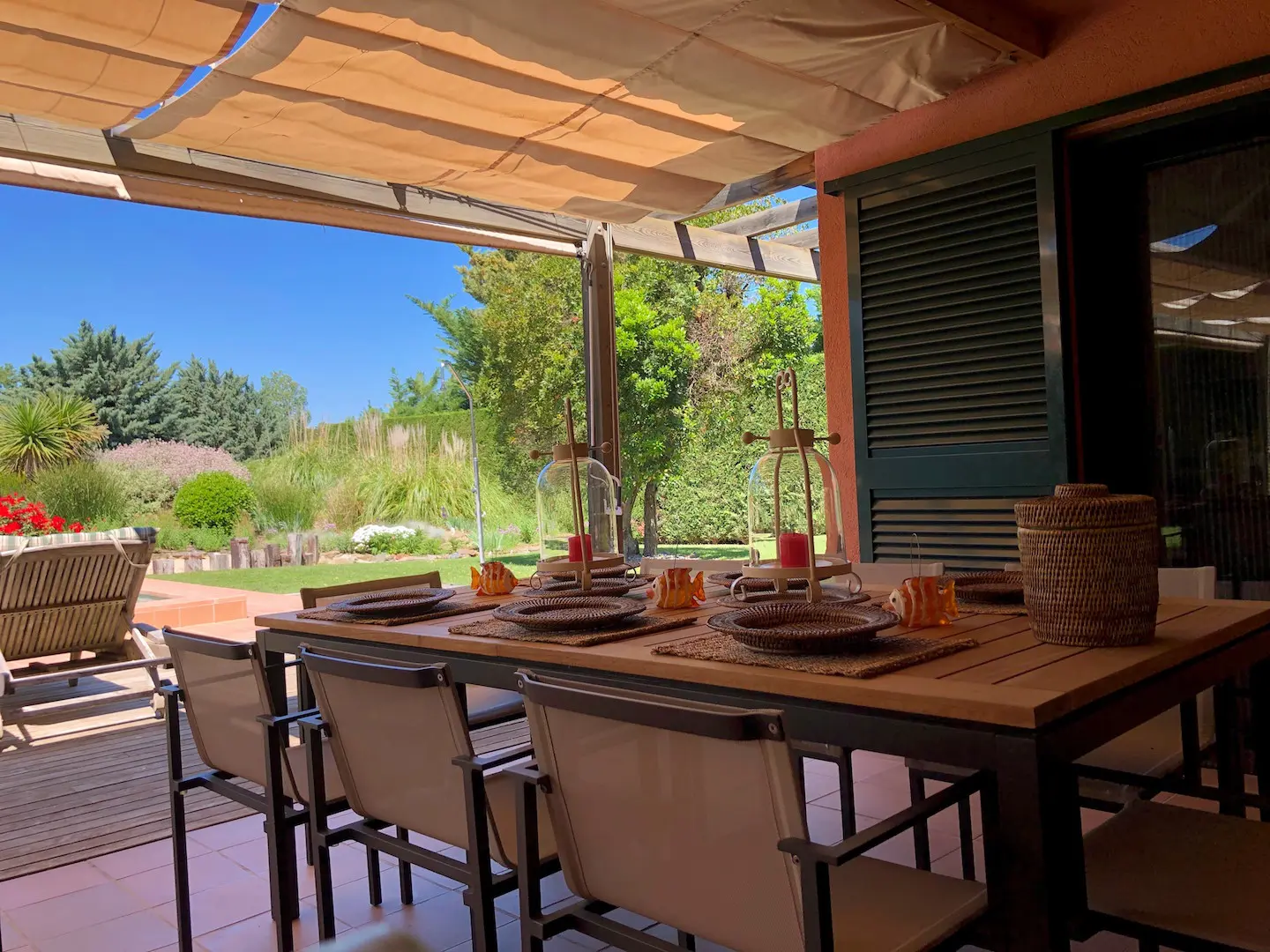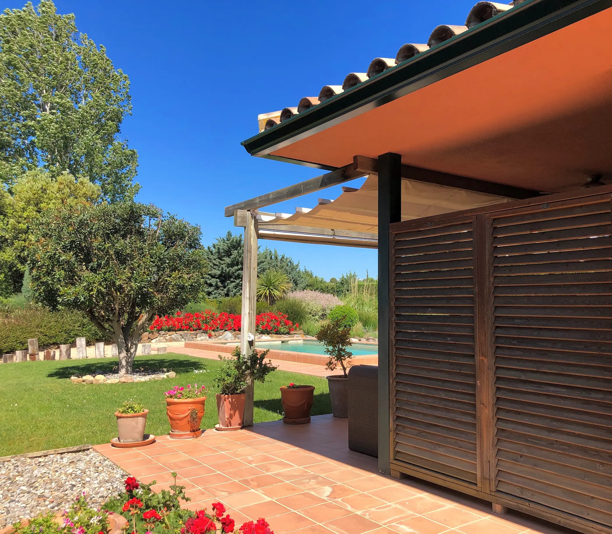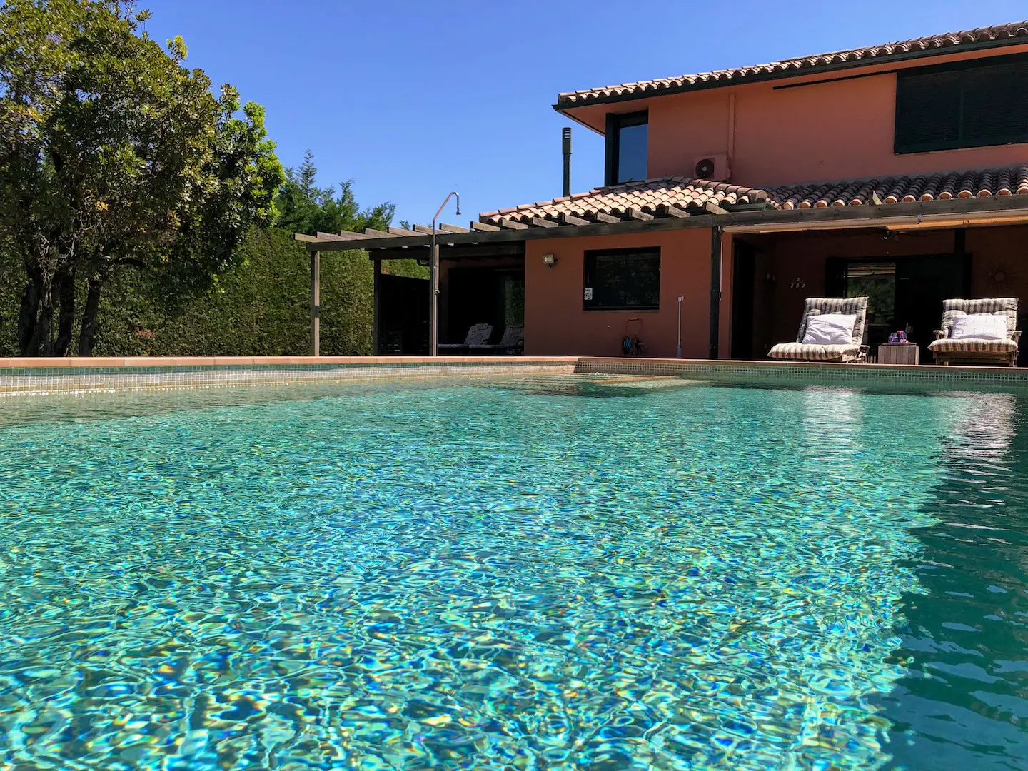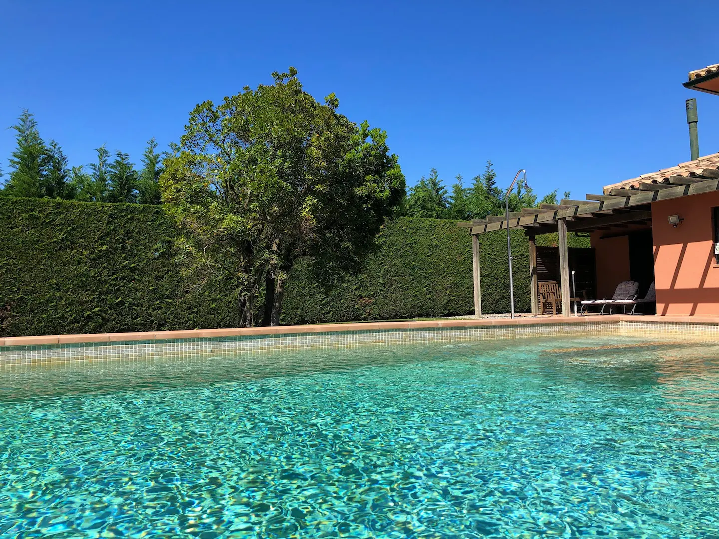 Het zwembad is luxe afgewerkt met ingebouwde trap, zitbank en zwembadverlichting. Eromheen liggen verschillende zonneterrassen en er is een buitendouche. Het overdekte terras kan verlengd worden met zonneschermen.