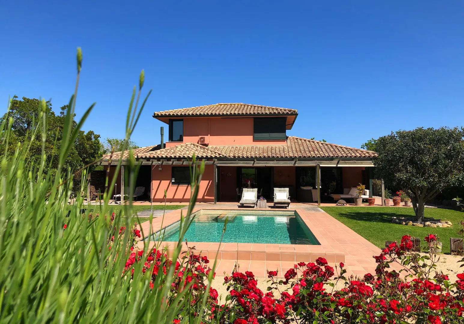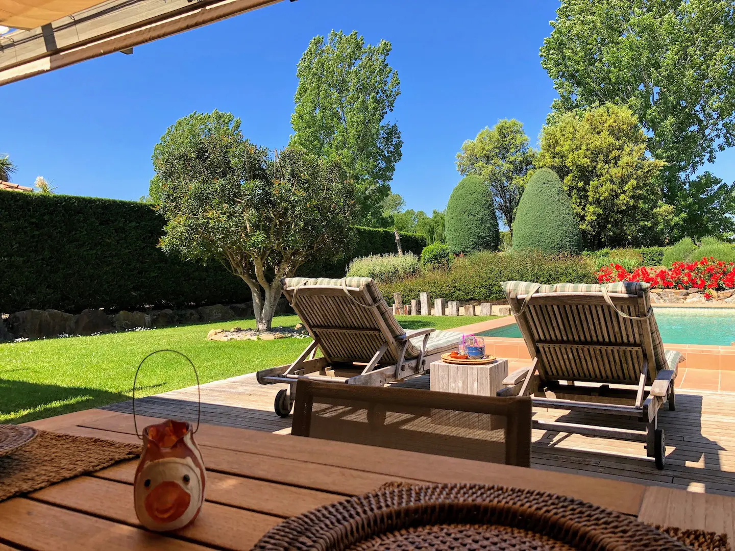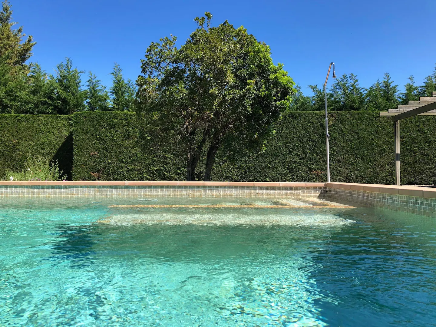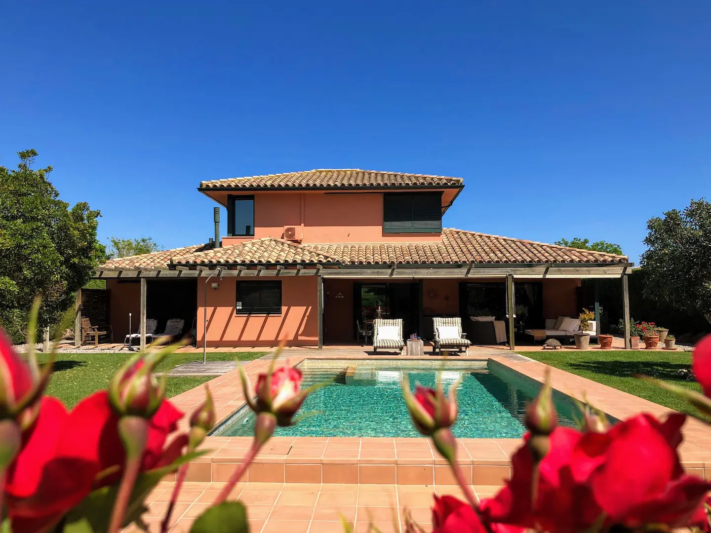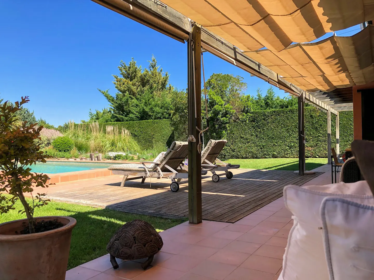 Het zwembad is luxe afgewerkt met ingebouwde trap, zitbank en zwembadverlichting. Eromheen liggen verschillende zonneterrassen en er is een buitendouche. Het overdekte terras kan verlengd worden met zonneschermen.