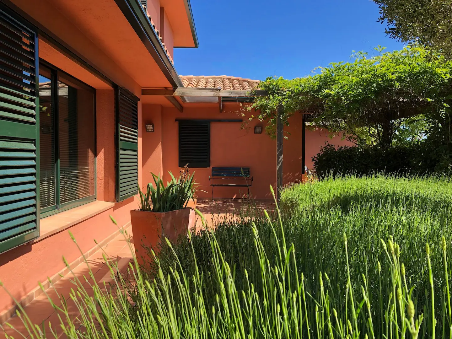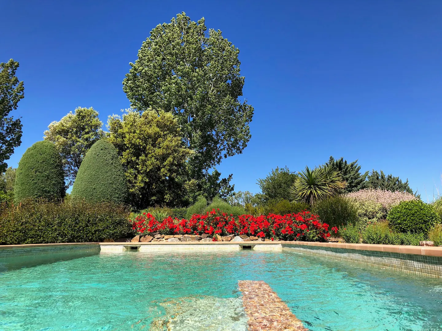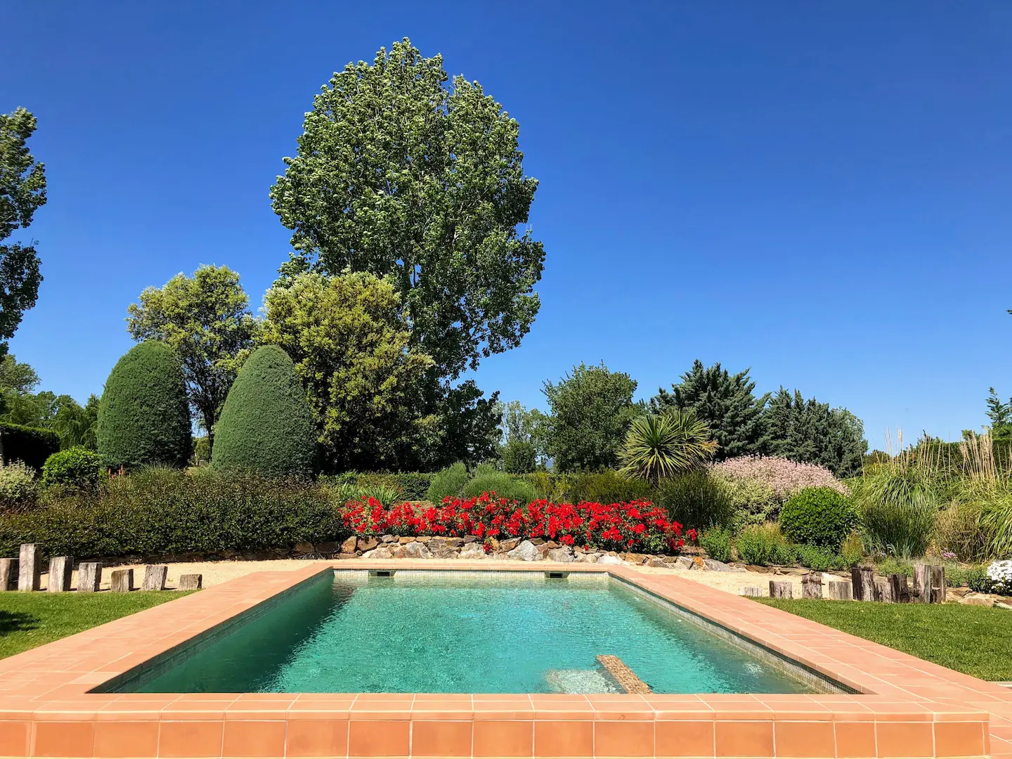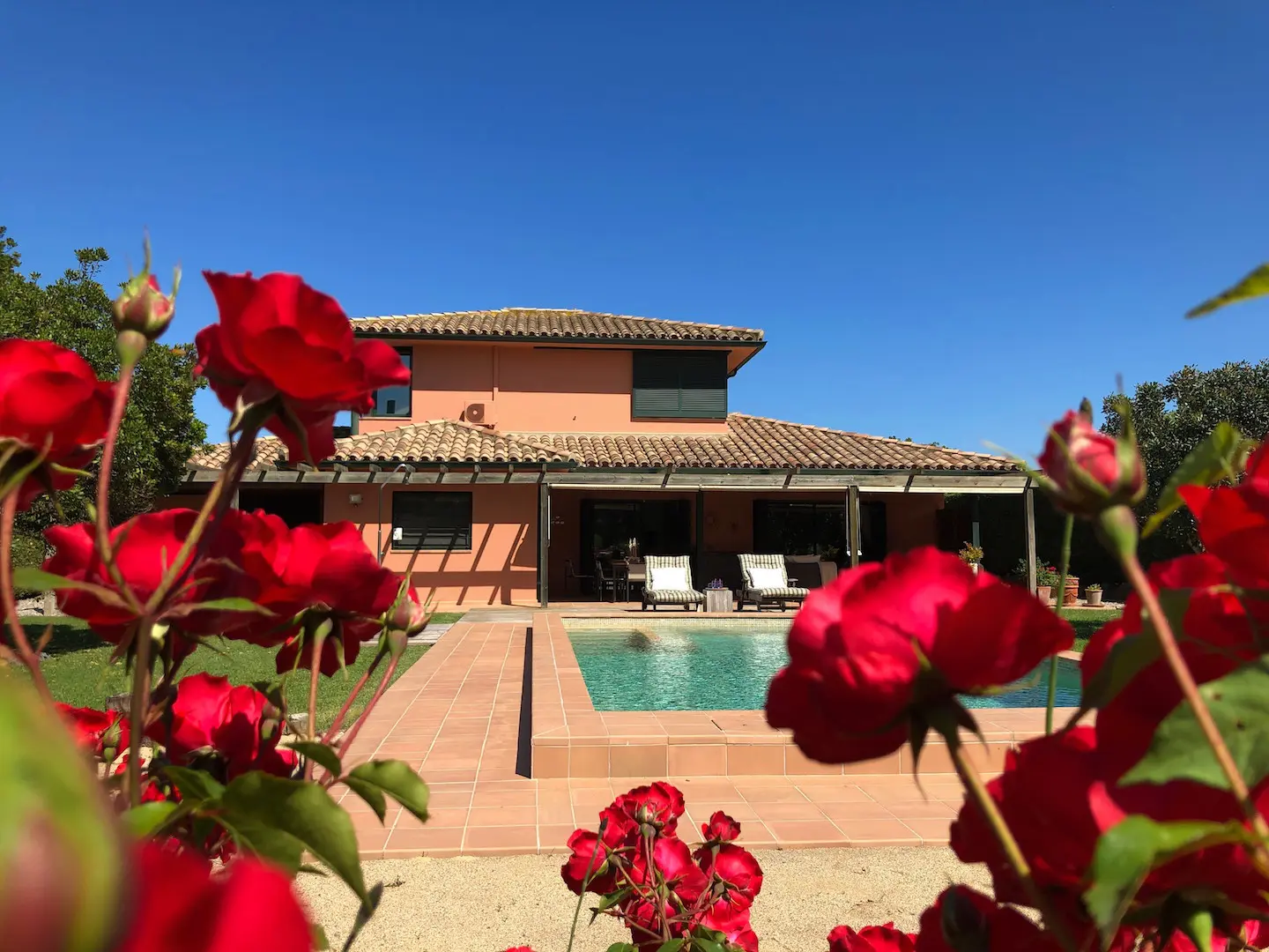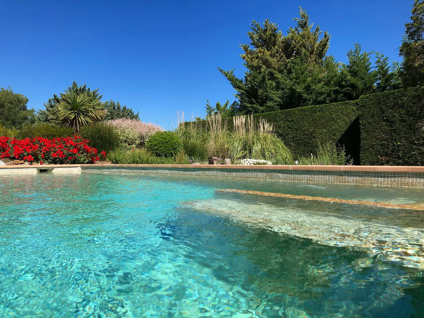 Het zwembad is luxe afgewerkt met ingebouwde trap, zitbank en zwembadverlichting. Eromheen liggen verschillende zonneterrassen en er is een buitendouche. Het overdekte terras kan verlengd worden met zonneschermen.