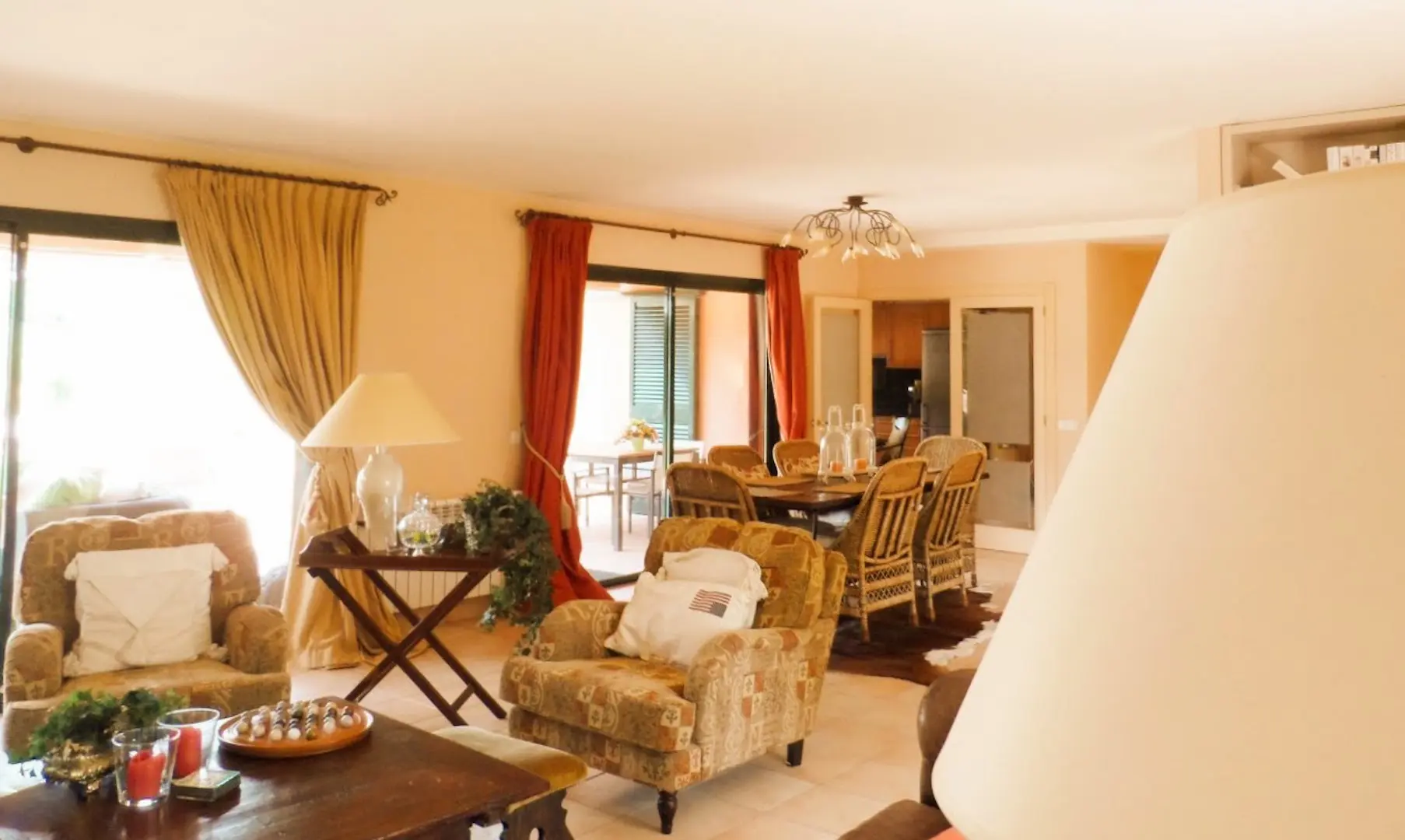 De ruime living heeft een apart werk-en eetgedeelte en via brede schuifpuien is er direct toegang tot de terrassen, de tuin en het zwembad. De ruime half open keuken is voorzien van een extra eetgedeelte, opslagruimte en geeft ook toegang tot het buitenterras. Op de begane grond zijn twee grote slaapkamers, ieder met eigen badkamer, inbouwkasten en een privé terras. Deze kamers zijn toegankelijk voor mindervaliden, met extra brede deuren en douche ingang. De verdieping heeft een aparte werkruimte met nog twee extra slaapkamers en twee badkamers.
